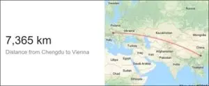 As the crow files, Chengdu to Vienna is a distance of 7,365 kms and takes 13.5 hours by air..
